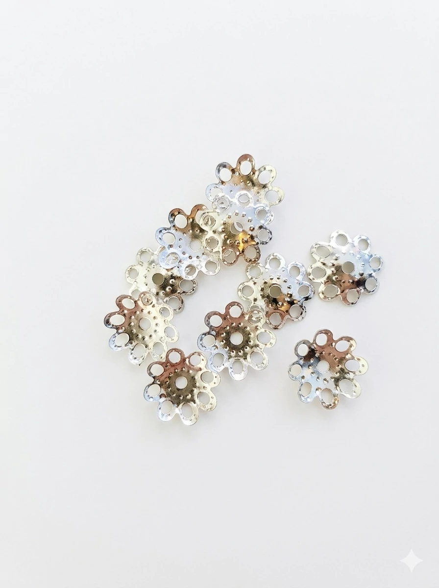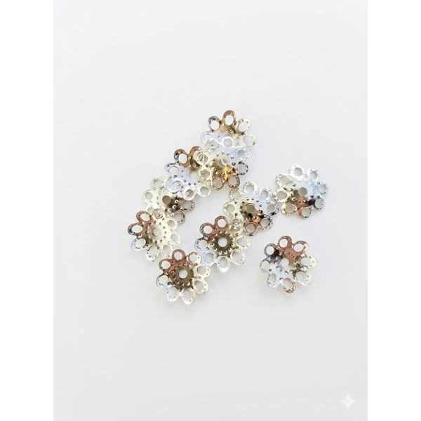 A 10db ezüst színű gyöngykupak ideális választás mindenki számára, aki különleges díszítéssel szeretné még szebbé tenni gyöngyékszereit. A 10mm-es kupakok elegáns megjelenést kölcsönöznek a gyöngy végére, és tökéletesen illeszkednek a különböző ékszerkészítési projektekhez. A bronzból készült, időtálló kupakok 1mm-es lyukukkal egyszerűsíti a használatot. Praktikus kiszerelésük révén mindig kéznél lesz a megfelelő díszítőkiegészítő, hogy a kreativitásod szabadon bontakozhasson ki!