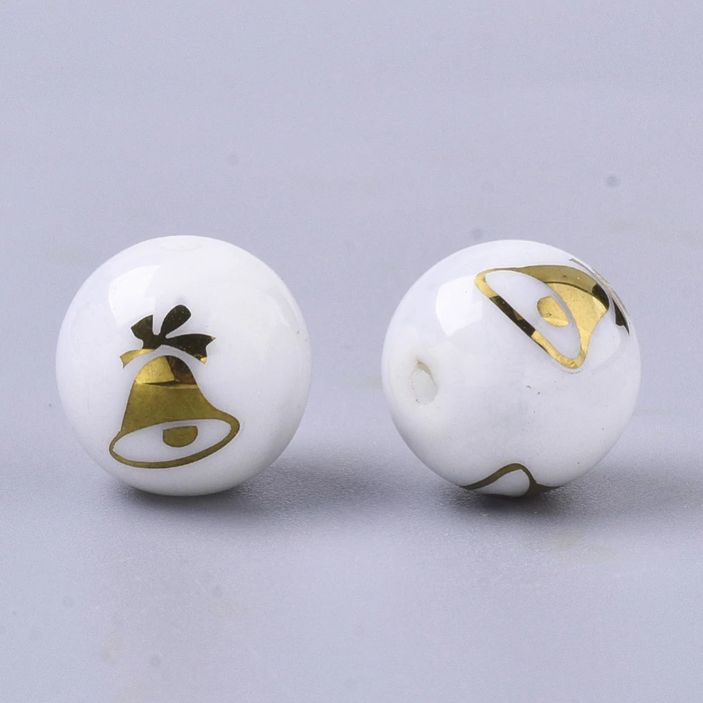 Fehér karácsonyi arany csengő mintás üveggyöngy (10mm)
