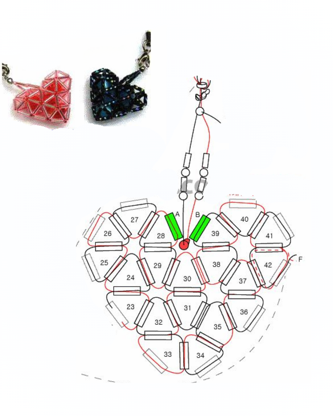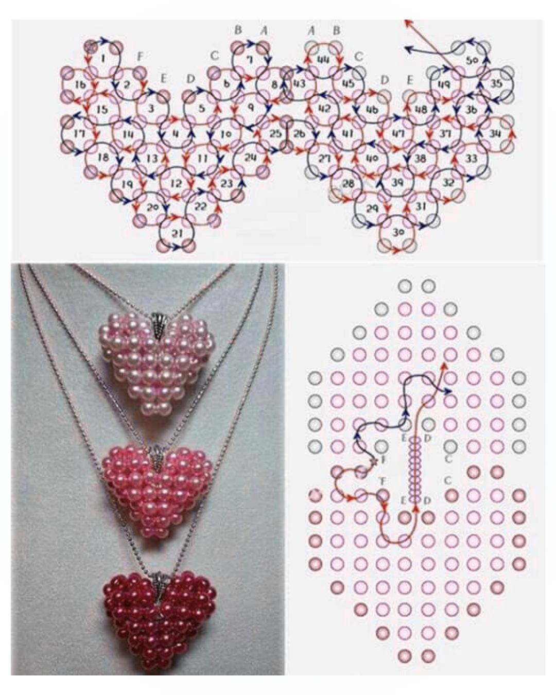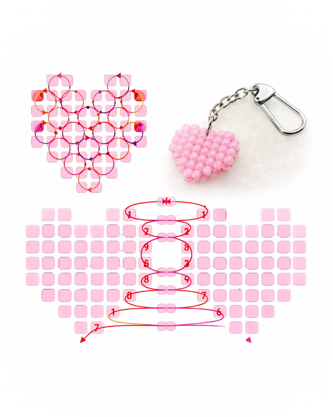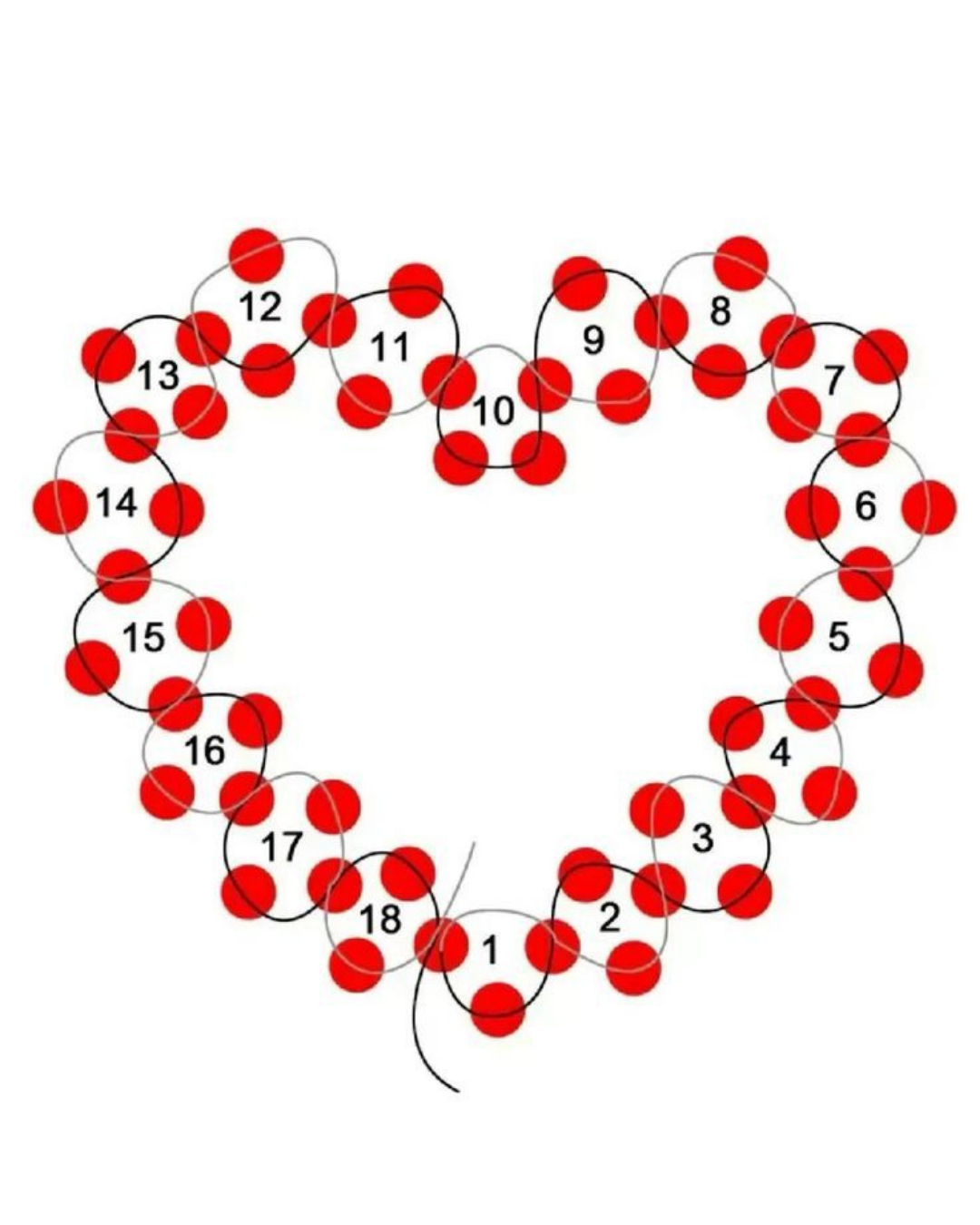 Technika: gyöngyszövés/térbeli fűzés (a minta megmutatja az útvonalat, hogyan „zár” össze a szív).