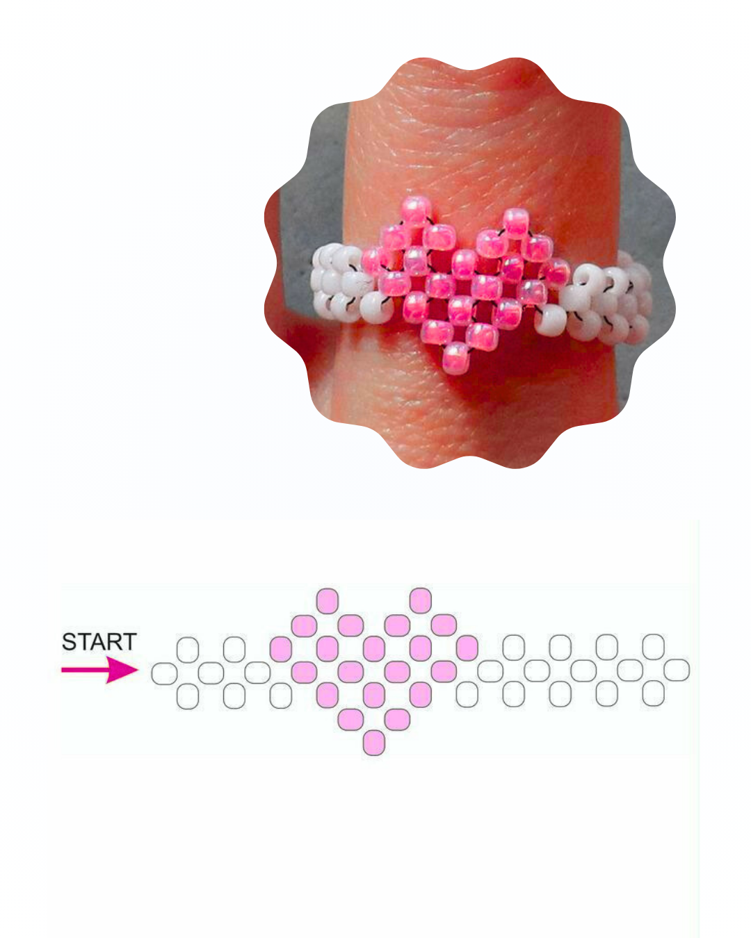 Technika: egyszerű két szálas fűzéssel készül. Kezdd a mintát a gyűrű résszel, folytasd a szivecskével majd ismét jöhet a gyűrű "teste" mérd az ujjadra, dolgozd el és már viselheted is!