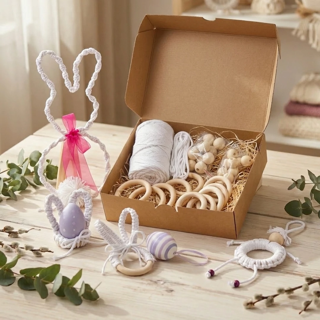 Ez a húsvéti kreatív box mindent tartalmaz, amire egy hangulatos ünnepi dekoráció elkészítéséhez szükséged lehet. A csomagban minőségi 3 mm-es Bobbiny makramé fonat, natúr fakarikák és fagolyók találhatóak. Ezekből az alapanyagokból egyedi nyuszis díszeket és tojástartókat alkothatsz.