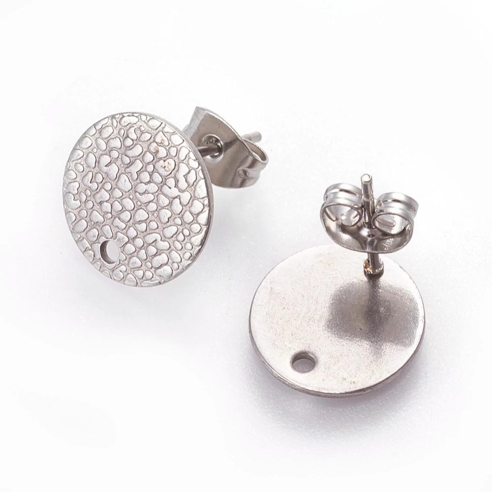 Bővítsd fülbevaló kollekciódat ezzel a nemesacél texturált bedugós, tovább építhető fülbevaló alapjával! A 12mm-es méret és a 1,2mm-es lyuk tökéletes alapot nyújt fülbevaló készítéshez. A nemesacél anyag nemcsak tartósságot biztosít, hanem eleganciát is kölcsönöz. Csak egy kis kreativitás szükséges – gyöngyökből, kabosonból, vagy akár más díszítőelemekből álmodd meg a saját stílusod! A fogó segítségével egyszerűen rögzítheted az alkatrészeket, ékszerragasztóval pedig még egyedi terveket is megvalósíthatsz. Vágj bele a divatos ékszerek készítésébe most!
