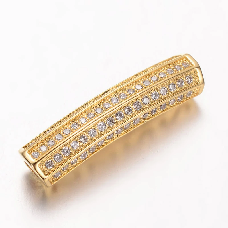 Az arany színű, strasszal díszített cirkónia cső tökéletes választás mindazok számára, akik stílusos karkötő készítést terveznek. A 27x6mm-es méretének köszönhetően könnyedén beleillik bármilyen kreatív elképzelésbe, legyen szó elegáns vagy laza kiegészítőkről. A bronz alapanyag garantálja a tartós használatot, míg a cirkónia strasszok csillogása elbűvölővé varázsolja ékszereit. Nikkelmentes, így érzékeny bőrűek is bátran viselhetik. Ne habozzon, hozza létre saját egyedi ékszereit ezzel a magas minőségű díszítőelemmel!