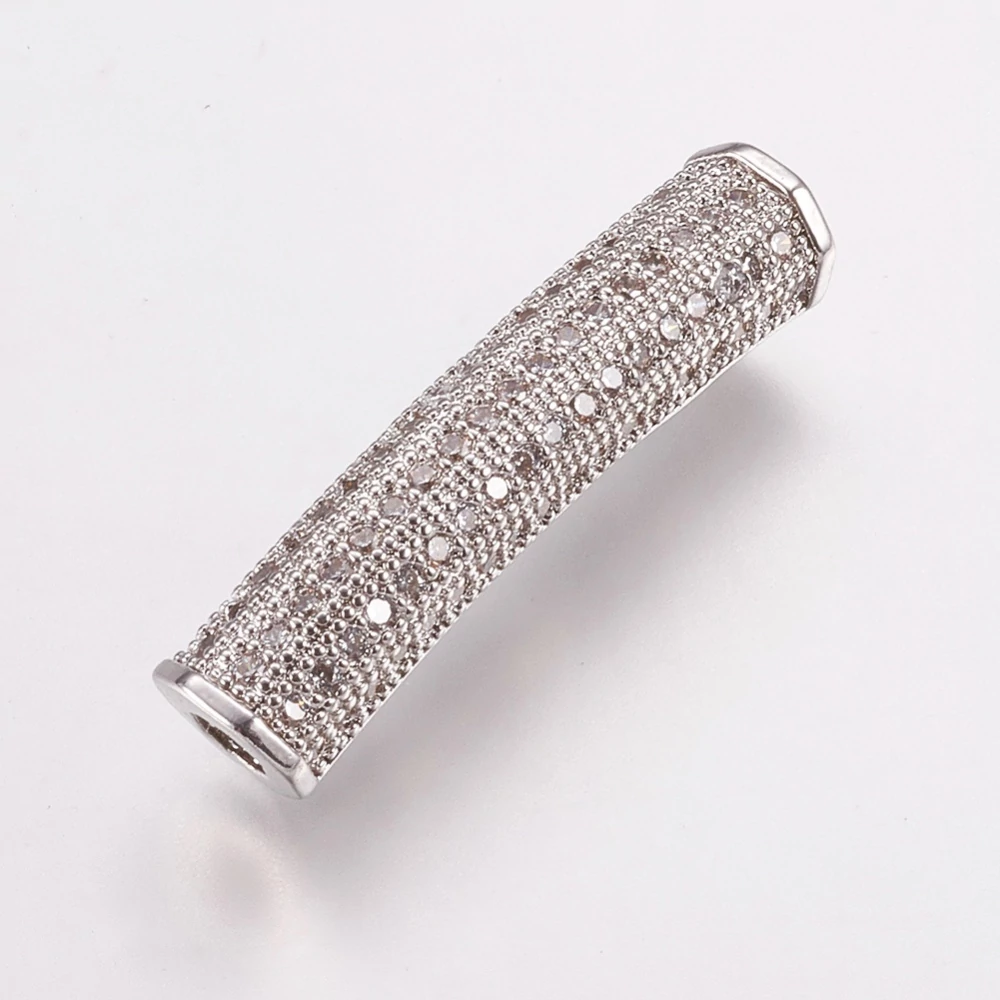 Strasszal díszített ezüst színű cirkónia cső (27x5mm) tökéletes választás minden ékszerkészítő számára, aki szeretne valami különlegeset alkotni. Ezzel a bronzból készült és brutális, ámde elegáns megjelenésű díszt tartós és nem kopik, így hosszú távú használatra is ideális. Az áttetsző cirkónia csillogása igazán kiemeli a karkötőkre vagy nyakláncokra tervezett ékszereidet. Lyukának mérete 2,5mm, így könnyedén variálhatod más elemekkel a saját stílusodnak megfelelően. Rendelje meg most és alkosson egyedi ékszereket!