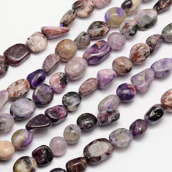 A Charoite egy rendkívül jellegzetes és lenyűgöző ásvány, amelynek szépsége már apró, zúzott formában is remekül érvényesül. A belőle készült ékszereknek éppen ez a jellegzetesség, a semmi mással össze nem téveszthető minta- és színvilág adja a vonzerejét. Örvénylő, selyemfényű mintázata és élénk, a levendulától a mélyliláig terjedő színei varázslatosak. Nem véletlen, hogy a spirituális átalakulás, a belátás és a nagylelkűség kövének tartják. Sokan azért viselik, mert úgy vélik, segít feloldani a negativitást, legyőzni a félelmeket, és elősegíti az önmagunknak való megbocsátást. A Charoite ásványgyöngy kifejezetten alkalmas hobbi ékszerek készítéséhez, mivel rendkívül ellenálló a véletlen sérülésekkel szemben.